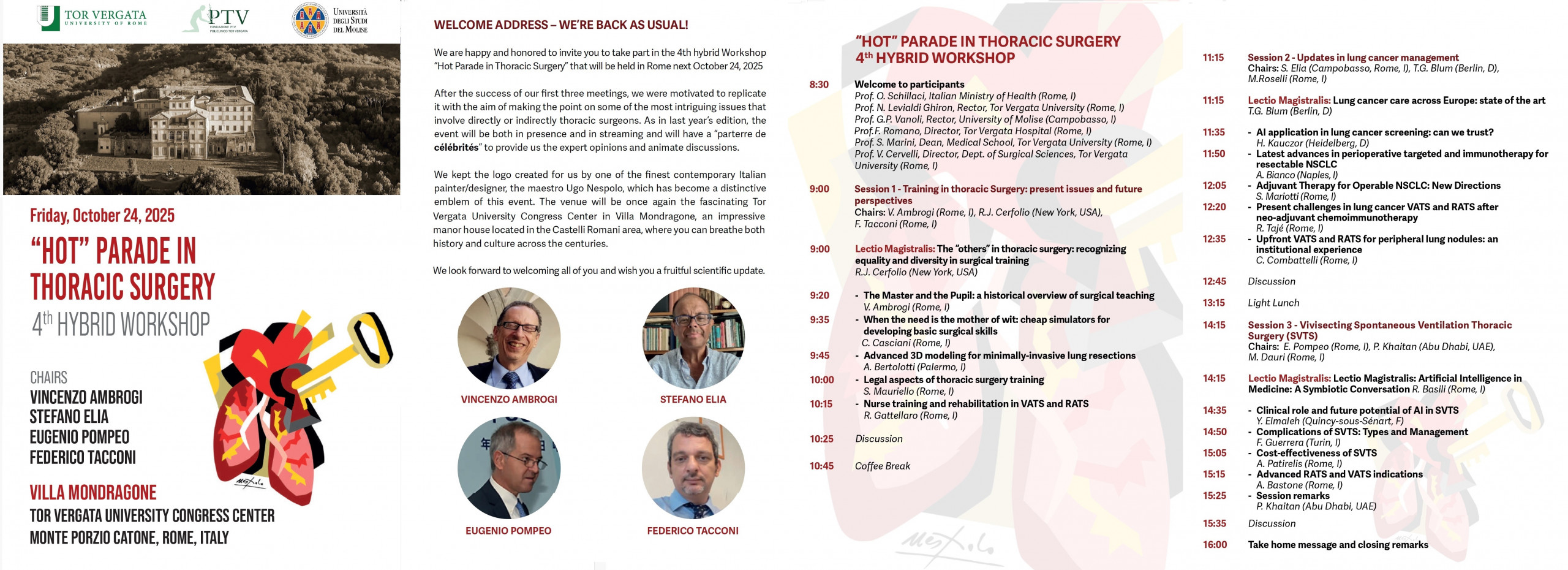- Workshop “HOT parade in thoracic surgery”, 20 Ottobre 2023, Tor Vergata University Congress Center, Villa Mondragone