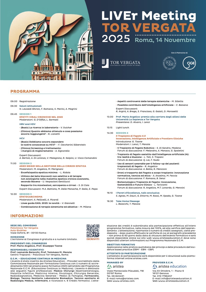 - LIVEr meeting Tor Vergata 2025 – 14 Novembre 2025- Policlinico Tor Vergata Aula Giubileo 0.4 CFU ADO