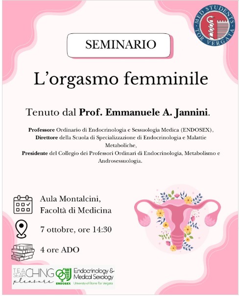 - Seminario del Prof. E.A. Jannini “L’orgasmo femminile”, 7 ottobre 2025 ore 14.30, aula Montalcini. 0.2 CFU ADO